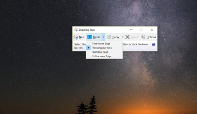 ویندوز 10 : در منوی Snipping Tool روی Mode کلیک کنید.