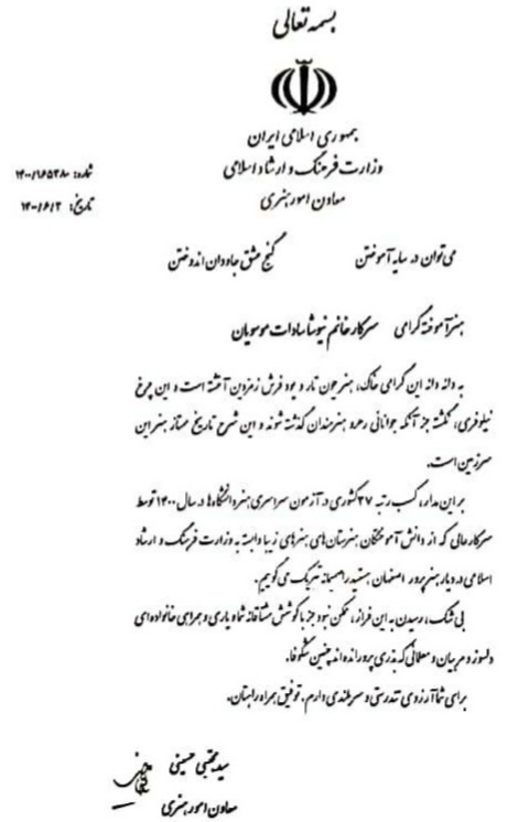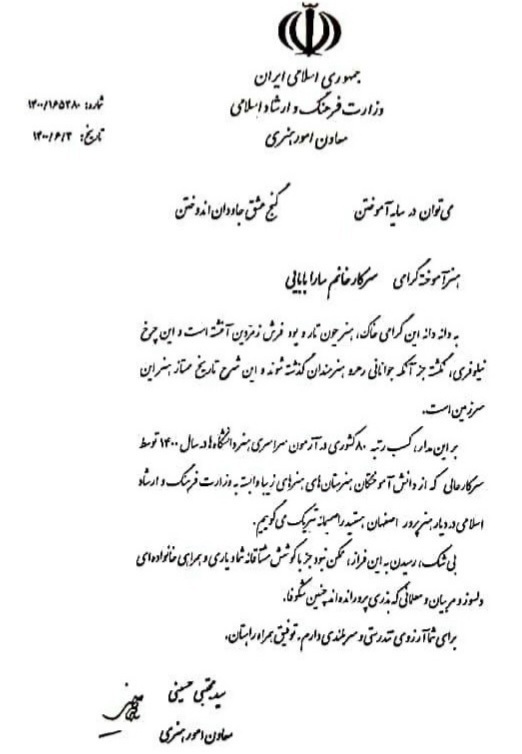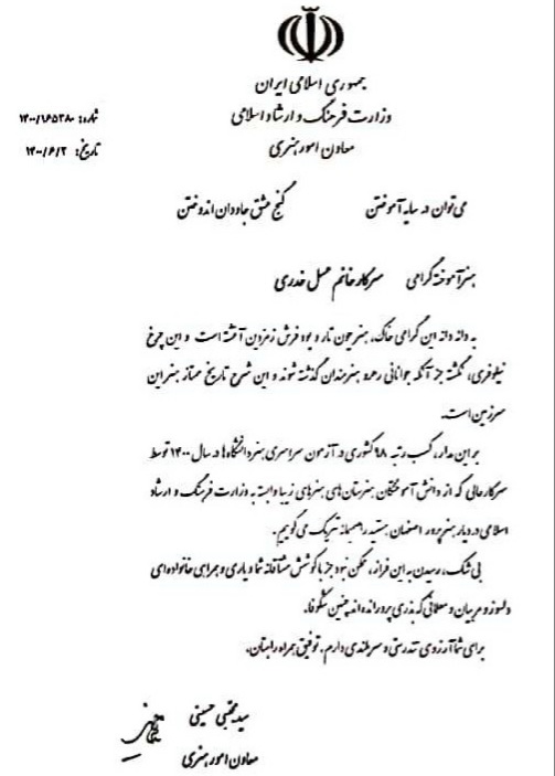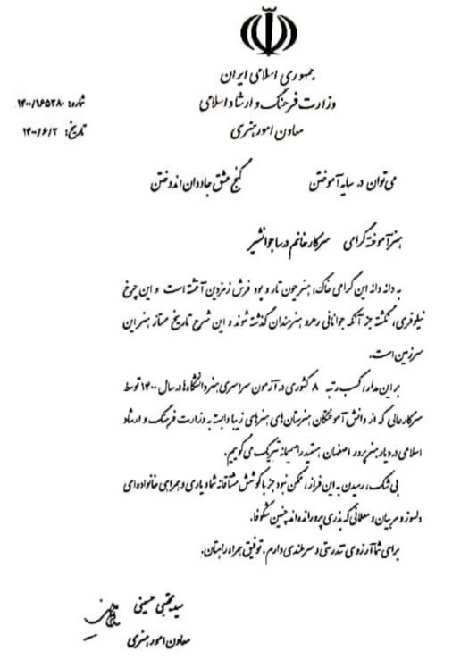 لوح سپاس معاون امور هنری وزارت فرهنگ و ارشاد اسلامی به افتخارآفرینان هنرستان در کنکور سراسری سال 1400 با کسب رتبههای تک رقمی و دو رقمی کشوری