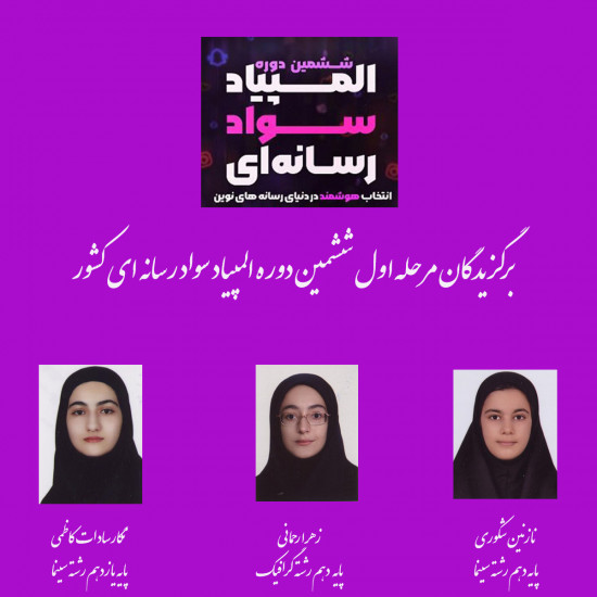 شایان ذکر است زهرا رحمانی هنرجوی پایه دهم رشته گرافیک، نازنین شکوری هنرجوی پایه دهم رشته سینما و نگارسادات کاظمی، هنرجوی پایه یازدهم رشته سینما، با کسب حد نصاب مرحله اول این المپیاد به مرحله دوم راه یافتند.