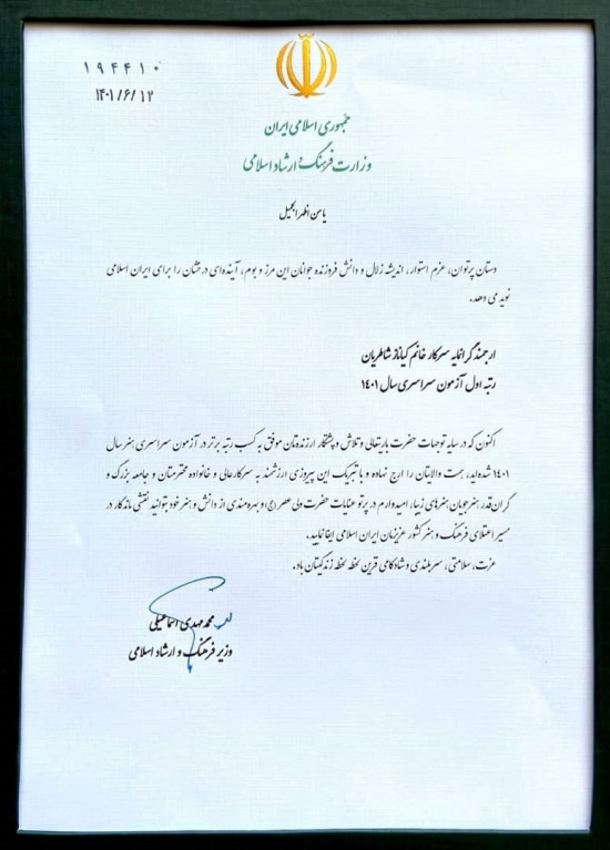 وزیر فرهنگ و ارشاد اسلامی از کیاناز شاطریان، رتبه اول کنکور سراسری سال 1401 تجلیل کرد