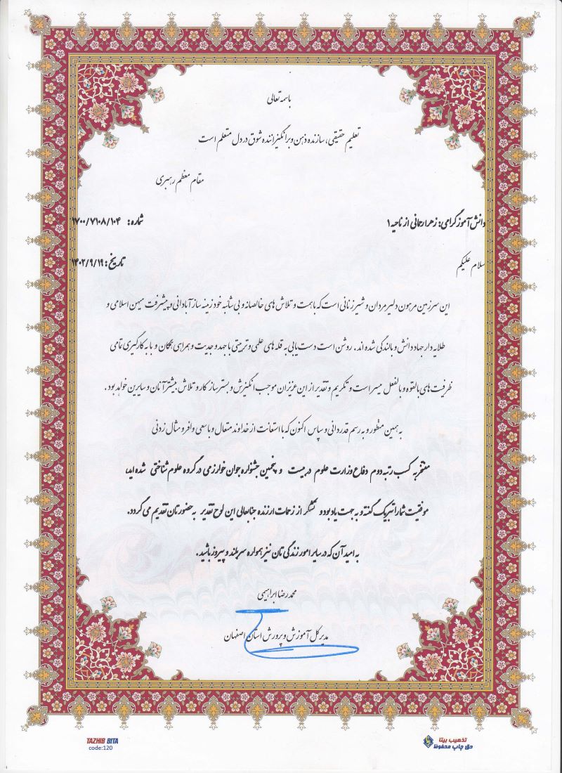 کسب رتبه دوم جشنواره جوان خوارزمی توسط زهرا رحمانی هنرجوی پایه دوازدهم رشته گرافیک