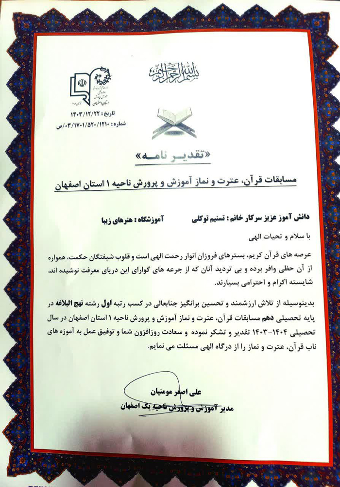 کسب رتبه اول رشته نهجالبلاغه مسابقات قرآن، عترت و نماز آموزش و پرورش ناحیه 1 توسط تسنیم توکلی، هنرجوی پایه دهم رشته سینما را به خانواده بزرگ هنرهای زیبا تبریک میگوییم.